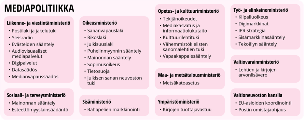 Kokonaisvaltaista mediapolitiikkaa haittaa se, että median toimintaedellytyksiin vaikuttavat asiat ovat hajaantuneet kymmeneen eri ministeriöön. Avoimen demokratian tueksi tarvitaan mediapolitiikkaa, jossa kaikkia eri ministeriöissä valmisteltavia päätöksiä arvioidaan koordinoidusti median toimintaedellytyksien kannalta.